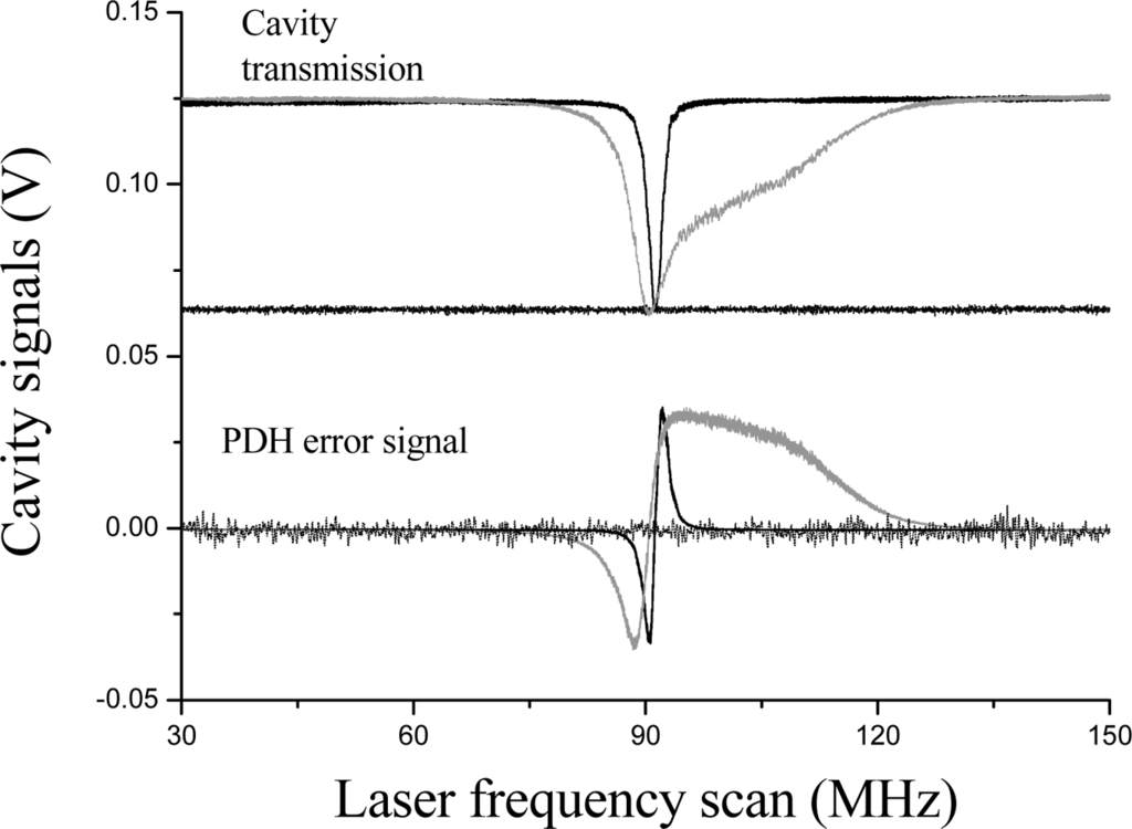 Locking of the laser to the fiber cavity resonance. Top: cavity transmitted power for free-running (black solid line) and locked laser with different low and high servo gains (gray and dotted line, respectively). Bottom: PDH error signal in unlocked (black solid line) and locked cases (gray and dotted line, respectively).