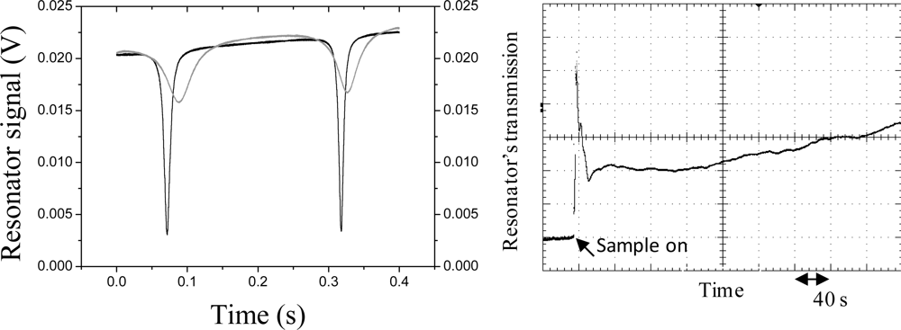 Cavity transmission signals in different cases. Left: free-running laser case with no sample on the EAB (black line) and with a sample (glycerol diluted at 99.5% with D2O) causing a small index overlay (gray line); right: laser-locked condition with the sample on the EAB.