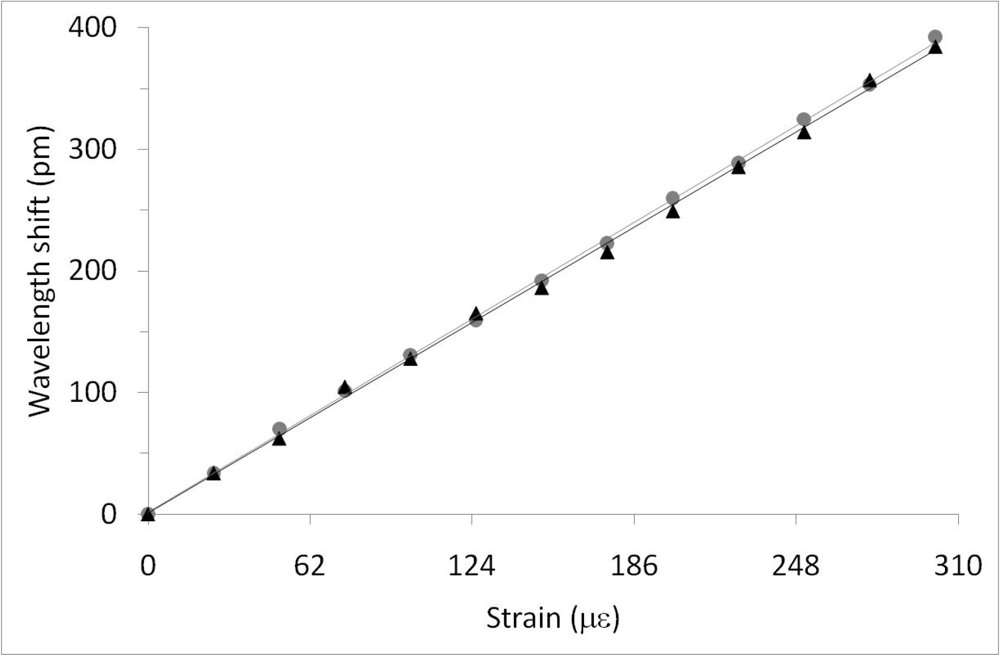 Calibration measurements with the single sensor have been carried out applying longitudinal loads using the PZT in a free-running configuration. In Figure 4, linear fits to the graphs give longitudinal strain responses of 1.26 ± 0.02 pm/με and 1.282 ± 0.009 pm/με for the slow and fast axes, respectively. Temperature factors obtained for the same FBG were 10.326 ± 0.02 pm/°C and 11.858 ± 0.2 pm/°C for the slow and fast axes respectively (Figure 5). The results for longitudinal strain sensitivity of the HiBi FBG are barely distinguishable while temperatures are significantly different. Noise effects that limit measurement accuracy, e.g., spurious optical reflections, can be significantly reduced by using optical components with better anti-reflection coatings in the polarization analyzer. Application experiments for this technique to the measurement of strain (longitudinal) and temperature, in both dynamic and static modes, have been performed.