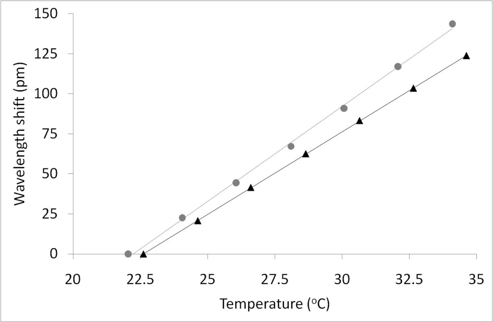 Temperature response for PM FBG in both the Fast and Slow axes of the fiber (10.326 ± 0.02 pm/°C and 11.858 ± 0.2 pm/°C for slow and fast axes respectively).