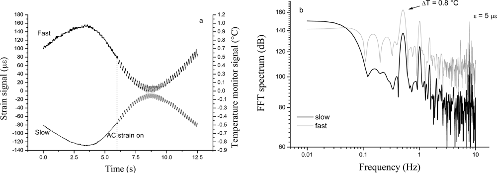 As a proof of efficiency of the sensing method, simultaneous detection of AC longitudinal strain (5 με peak-to-peak) and temperature change (0.8 °C peak-to-peak) is demonstrated in Figure 6. It is worth noting, from Figure 6a, how the system detects both strain and temperature variations applied at different frequencies simultaneously by the slow-axis (ECL) and the fast-axis (DFBL) signals. These signals are currently not corrected for the difference between the two laser servo gains: indeed they have opposite sign since the locking correction for the fast SOP is fed back to the injection current of the DFB laser, while a PZT is used for low-frequency control of the extended-cavity laser for the fast SOP. The Fourier transform of Figure 6a, shown in Figure 6b, has two marked peaks above the background, corresponding to mechanical (8 Hz) and thermal (0.5 Hz) stress excited in the fiber. A preliminary sensitivity estimate, based on the noise floor of Figure 6b, indicates that quasi-static strain near to the 10 nεrms/√Hz level is within the capability of our system. At higher acoustic frequencies (500—1000 Hz), we measured a sensitivity improvement of nearly a factor of 100 (100 pε/√Hz). Analogously, for small temperature changes, a minimum detectable temperature variation of 5 mKrms/√Hz can be extrapolated.