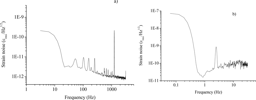 The test experiment on the PM FFP has been carried out only for mechanical deformations so far. Using a low-voltage PZT, attached to the FFP aluminum cylinders, we applied static and dynamic axial strain to the intra-cavity fiber, while the laser and its secondary carrier are frequency locked to two distinct, crossed-polarized resonances. As shown by Figure 11, the sharp peak at 900 Hz demonstrates that the system was capable of detecting smaller signals when compared to a single FBG sensor, thanks to the resonator enhancement effect. Figure 11 shows a strain-noise level approaching 60 pε/√Hz. Sensitivity degradation (by about a factor 10) is expected towards lower frequency, mostly due to ambient noise and laser jitter contributions.