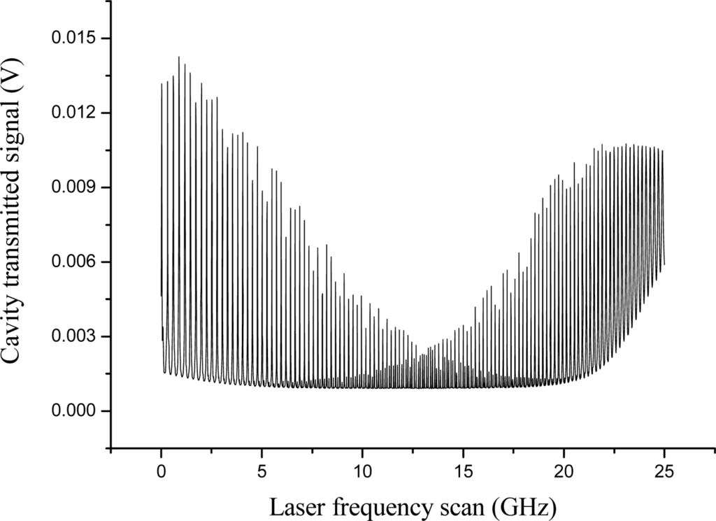 The experimental set-up used to interrogate the fiber resonator and extract the absorption information is shown in Figure 19. The OFR was built using SMF-28 fiber (length is about 2.5 m) and a variable-ratio fiber coupler (1—99%) to inject near-infrared radiation into the cavity. A fiber evanescent-field access block (EAB) allowed the (evanescent) cavity-field to interact with the external environment. We use an extended-cavity diode laser emitting in the telecom region of the spectrum (1,560 ± 30 nm) as a coherent-light source. It was frequency modulated at about 2 MHz through its bias-tee input, so that symmetrical sidebands are superimposed on the carrier frequency. The laser, equipped with a single-mode polarization-maintaining (PM) fiber pig-tail, was directly connected to one port of a single-mode coupler via a fiber polarization controller (PC) in order to define the state of polarization and select a specific cavity eigenmode. The fiber coupler also collected the radiation that partially leaked out from the loop. The transmission peaks observed on cavity resonances over a laser-frequency sweep are shown in Figure 20.