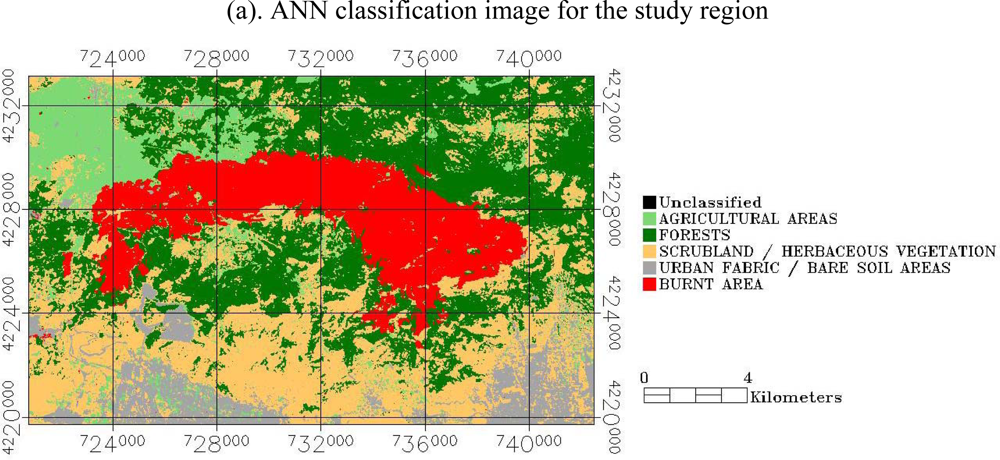 Clearly, although the present study demonstrates the potential of the examined here classifiers to be used in burnt area mapping, further studies should be conducted in dissimilar settings representative of the full range of Mediterranean site characteristics examining the applicability of these methods for this type of application. Recent advances in remote sensing instruments, have resulted in the development of hyperspectral satellite sensors (e.g., EO-1 Hyperion), which allow the retrieval of spectral information in a large number of narrow and contiguous spectral bands. Such sensors, have created new challenges in retrieving land cover information, including burnt areas [53], and deserve attention for future investigations of this type.