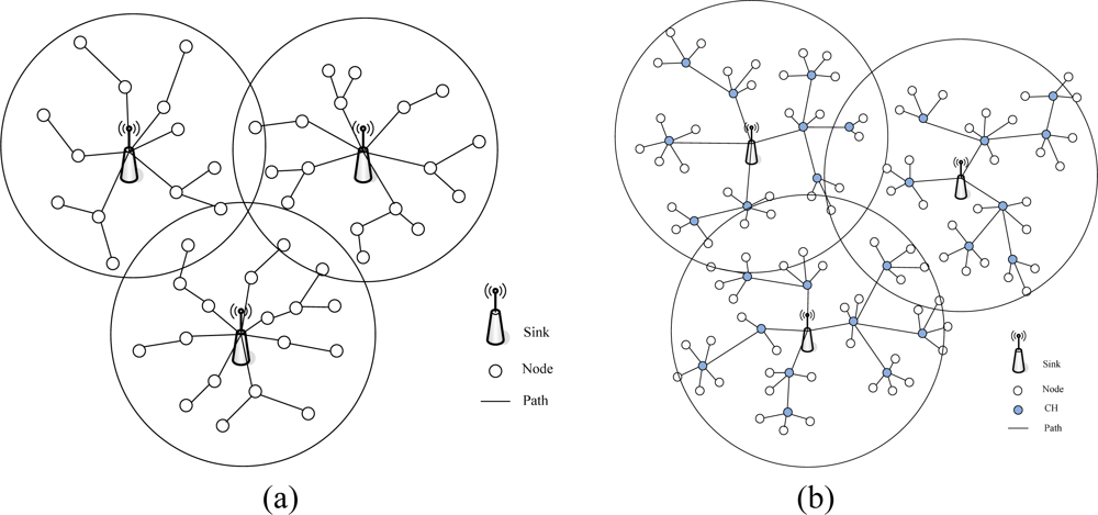 Sink-centric multiple sink cluster WSNs. (a) Sink as cluster head. (b) Non-sink as cluster head.