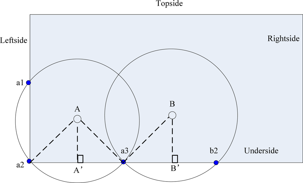Figure 10 gives a simple illustration of a radio radius calculation. For the underside border of the work area, the first sink A has the euclidean distance |Aa2| as its transmission range RA,1, then sink B can calculate RB,2 according to RA,1 by: