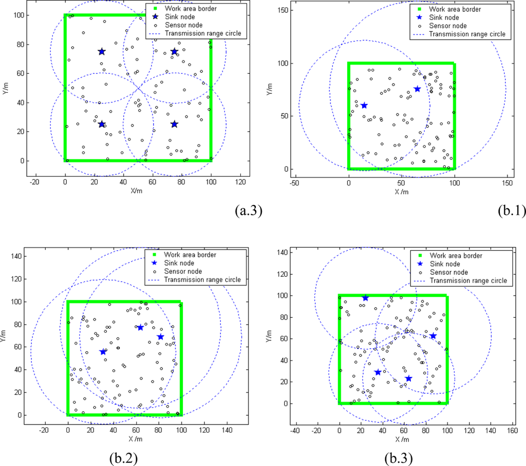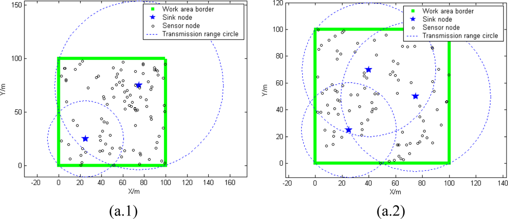 Figure 11 shows that whether sinks are fixed or randomly deployed, both conditions can obtain a satisfactory percentage of network coverage. The network is more regular in fixed mode [seen in Figure 11(a)], but more easy to deploy in random mode [as seen in Figure 11(b)].