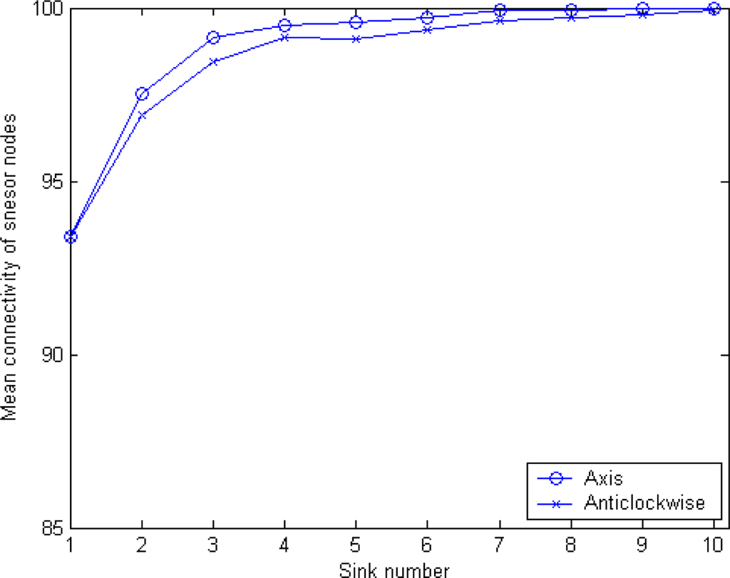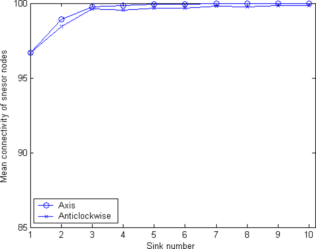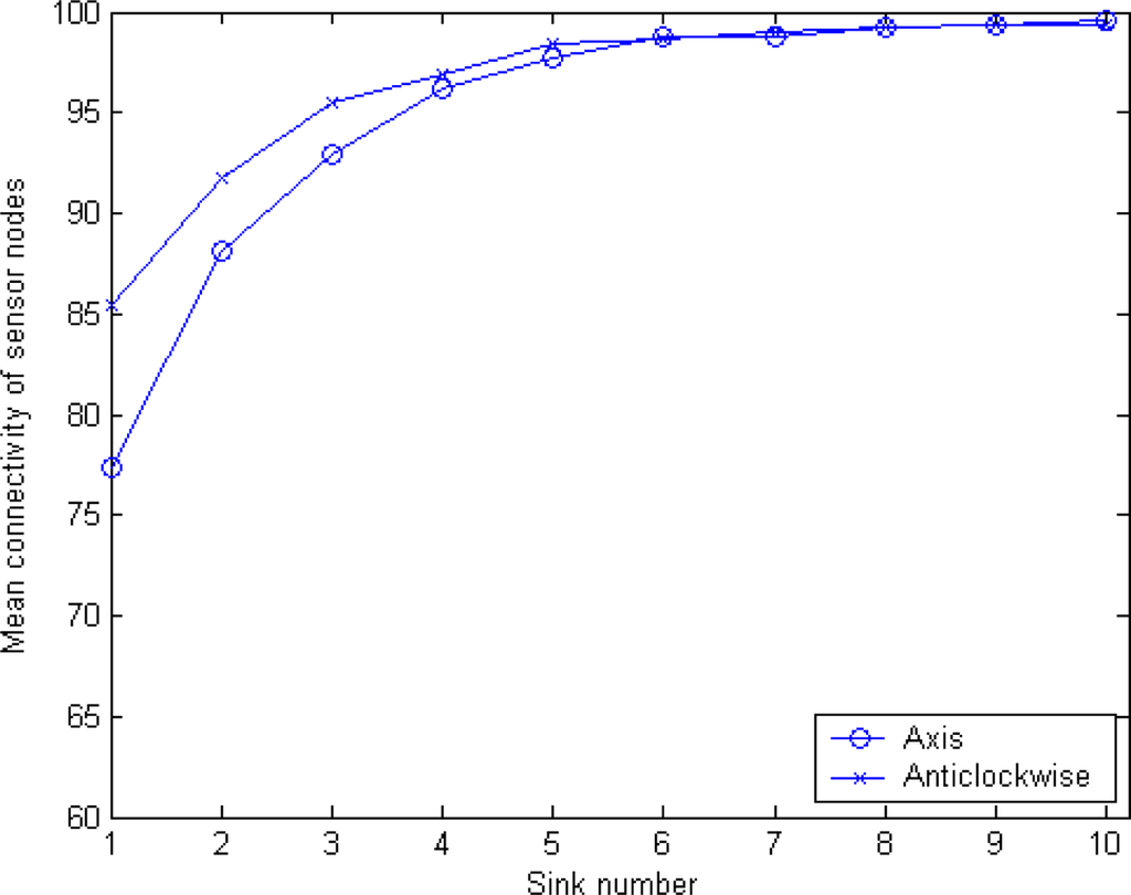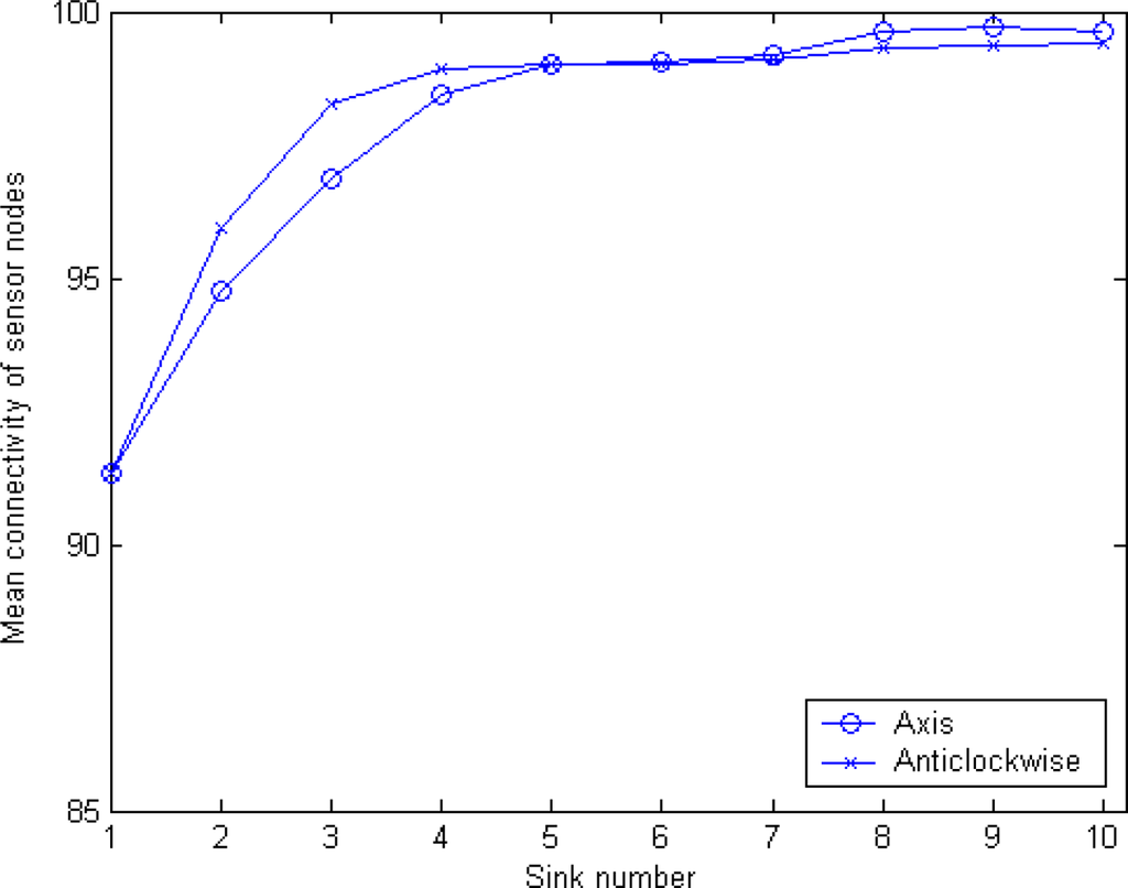 Figure 13 shows the relationship between the number of sinks and the mean connectivity of sensor nodes, when only considering MSBSRC. It can be seen that by employing MSBSRC a great improvement in network coverage is achieved. Unlike in original MSCWSNs-PC, axis mode provides higher mean connectivity compared to anticlockwise mode.