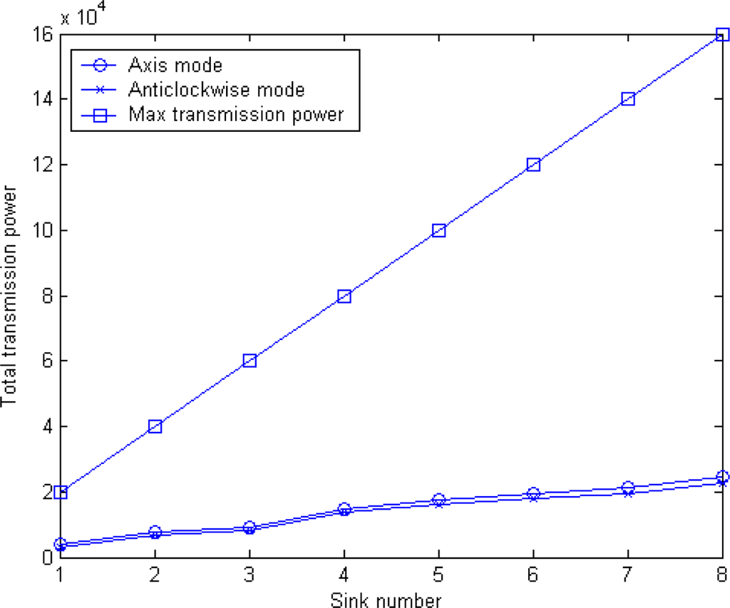 Figure 16 shows the comparisons of the total transmission power between MSCWSNs-PC and maximum transmission power per round. As shown in Figure 16, MSCWSNs-PC achieves an improvement of several orders of magnitude compared to maximum power transmissions and with the increase of the number of sink the gap between the two lines gradually widens. For the two modes of axis ordering orientation, more total transmission power is needed in axis mode, but the gap between the two modes is very small.