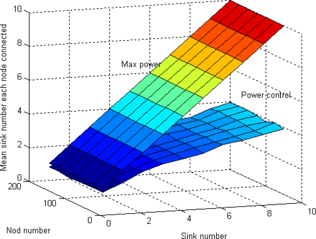 To reduce inter-cluster interference, each cluster in LEACH communicates using TDMA and direct-sequence spread spectrum (DSSS). Each cluster uses a unique spreading code; all the nodes in the cluster transmit their data to the cluster head using this spreading code and the cluster head filters all received energy using this spreading code. This is known as transmitter-based code assignment [27], since all transmitters within the cluster use the same code. In this paper, clustering interference is defined as the mean number of sinks a node senses. Wen a node wants to select a sink as its cluster head, the less sink node it hears, the less energy it needs to consume. Figure 17 shows that by using our algorithm, less sensor nodes need to decide which sink they should belong to. The reason is that since all sinks are broadcasting in a more smaller radio range by using MSCWSNs-PC, then less sensor nodes can receive the broadcast packets.