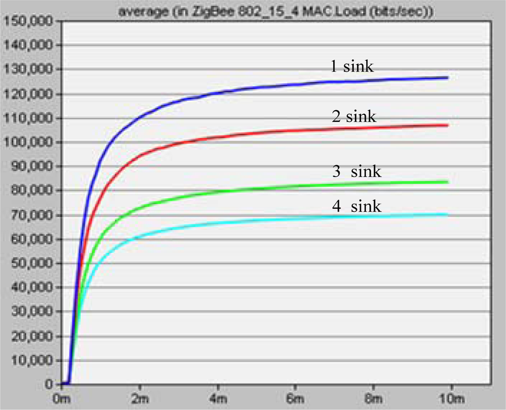 Figure 18 shows network load for different sink numbers. The more sinks deployed, the lower a network load is created. When more sink nodes are deployed, the source node has a chance to choose a nearer sink to transport its data packet to. This results in a significant decrease in the total communication hops, and results in a greatly lower load on the system.