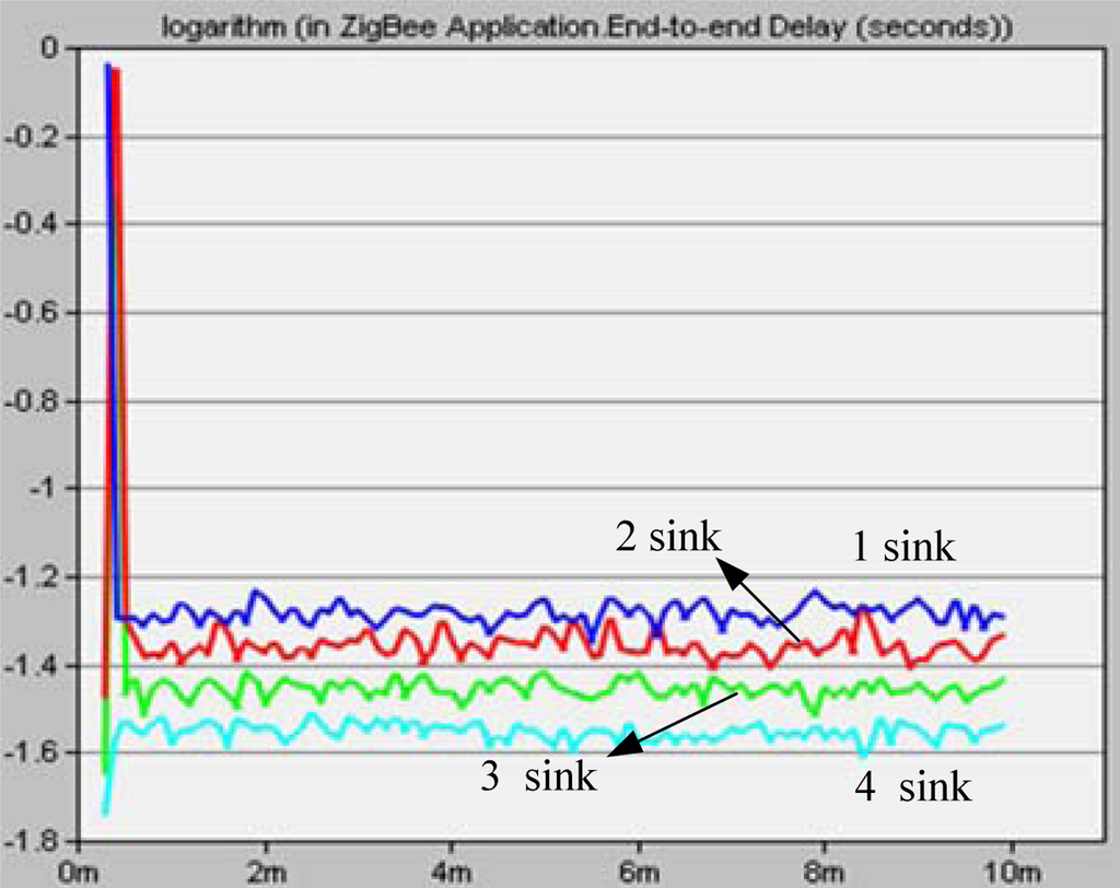 In Figure 19, end-to-end delay of MSCWSNs-PC decreases as sink number increases. The performance of end-to-end delay when using four sink nodes always outperforms in terms of less sinks. In MSCWSNs-PC, more sink nodes result in shorter data transport paths and lower loads which have a significant impact on decreasing networks congestion. Thus, congestion is more likely to happen when less sinks are deployed.