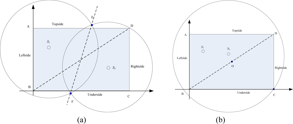 Proof. Firstly, assume two sinks were deployed at different sides of the diagonal line [see Figure 2(a)], a straight line through the two intersection points E and F, and | S2 D |> | S2 C |, | S1 B |> | S1 A |, so the intersection of AEFB and EDCF always contains the rectangle work area ABCD. If the corresponding diagonal vertex (in same position direction, such as S2 and D) is inside the radio range of the sink, the radio range of all sinks contains the whole work area. When two sinks are on the same side, the sink nearer to the centre of rectangle uses the distance between the farthest vertex and itself as radio radius, the other three vertices must be in the radio range. It means that the sink has enough transmission power to cover the whole work area. The other sink does not need to work at this time.