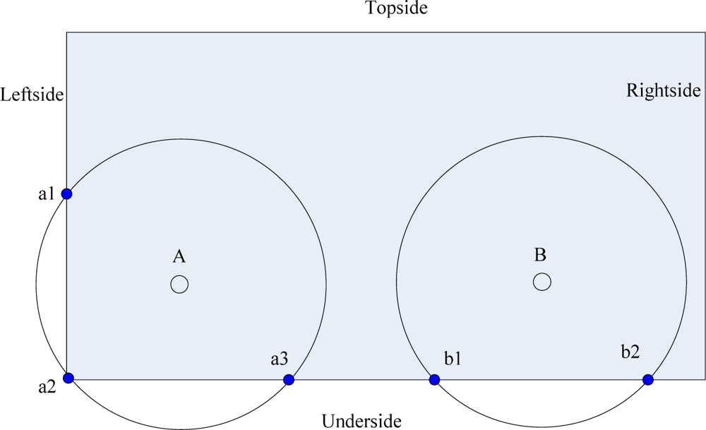 In MSCWSNs, firstly each sink pre-detects its coarse position in the work area and the corresponding set of coordinates is (XTopside, YTopside), (XUnderside, YUnderside), (XLeftside, YLeftside), (XRightside, YRightside). The sink number of each group is nunsinkTopside, nunsinkUnderside, nunsinkLeftside, and nunsinkRightside. Secondly, we make four sequences in a given order, respectively, according to the value of XTopside, XUnderside, YLeftside, and YRightside. Then the sink with the lowest order in each group uses the distance between the corresponding vertices of the rectangle and itself as its radius, then each these sink has three cross points with the boundary of the rectangle, (e.g., node A in Figure 4). The other sink at least have two cross points with the corresponding nearest border by employing an enough transmission power, (e.g., node B in Figure 4). Set a current sink node w(xw,yw) wants to pre-detect its coarse position in work area.