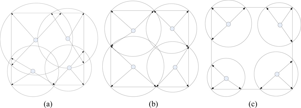 Illustration of radio radius calculation when deploying 4 sink nodes in work area. (a) Too large. (b) Appropriate. (c) Too small.
