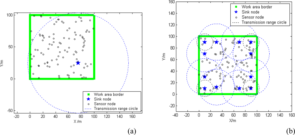 Illustration of WSNs with two sink nodes. (a) Two sinks at different sides; (b) Two sinks on the same side.