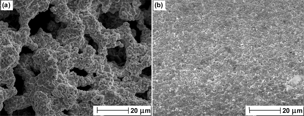 SEM images of (a) the spherical Ag/AgCl material from a thermal electrolytic electrode and (b) the Ag/AgCl material from an electrolytic electrode.
