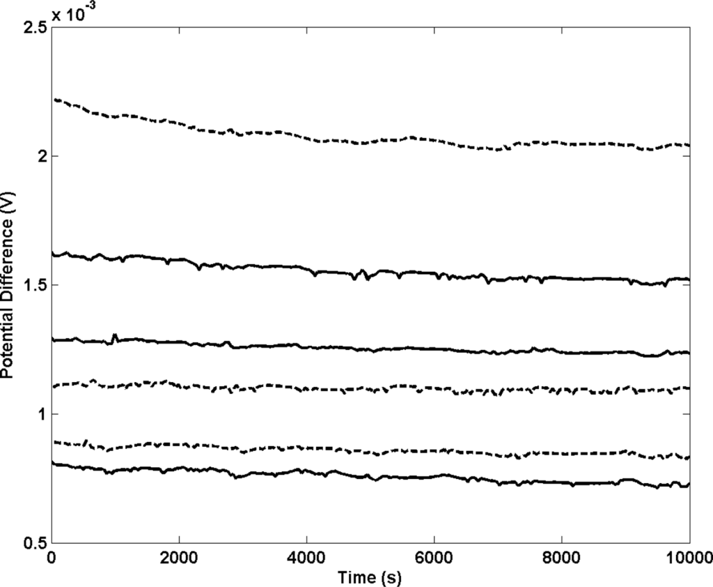 Figure 2 shows the differential potential transients of a selection of electrolytic Ag/AgCl electrodes compared to a thermal electrolytic Ag/AgCl defacto reference. Electrodes manufactured with no pretreatment of the Ag material prior to electrolytic conversion to Ag/AgCl are represented with solid lines. The long term stability of these electrodes display the typical behaviour shown in previous work [14] and deviate in each case by about 100 μV across the measurement period of approximately 3 hours (chosen to represent the time period typically employed for making Harned cell measurements of pH). As expected, the transients are poorly repeatable and would not meet the specification for use in the Harned cell as the bias between any two electrodes is large (with the largest difference being approximately 800 μV). A large bias in potential between these electrodes and the thermal electrolytic defacto reference also exists (approximately 1 mV) as has previously been reported [14] and attributed to strains and probable impurities introduced in the drawing process of the Ag wire used to produce the electrodes. This effect might also account for the variability in potential between electrodes [17]. An experiment was conducted to investigate whether the repeatability of the potential transient and the bias with respect to the defacto reference would worsen if further strains were introduced to the wire. Electrolytic Ag/AgCl electrodes were prepared using Ag wire that had undergone a bending process whereby the material was flexed in a controlled manner (i.e., backwards and forwards ten times with a bend radius of 2.5 mm). The resultant ensemble of potential transients (dashed lines) display no appreciable differences to the transients from electrodes manufactured with no pretreatment of the Ag wire. This suggests that the bias in potential between electrodes and the defacto reference cannot be altered significantly from poor handling and is most likely attributed to the variability in the drawing process of the wire from strains or introduced contaminants.