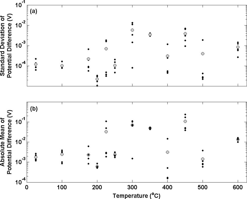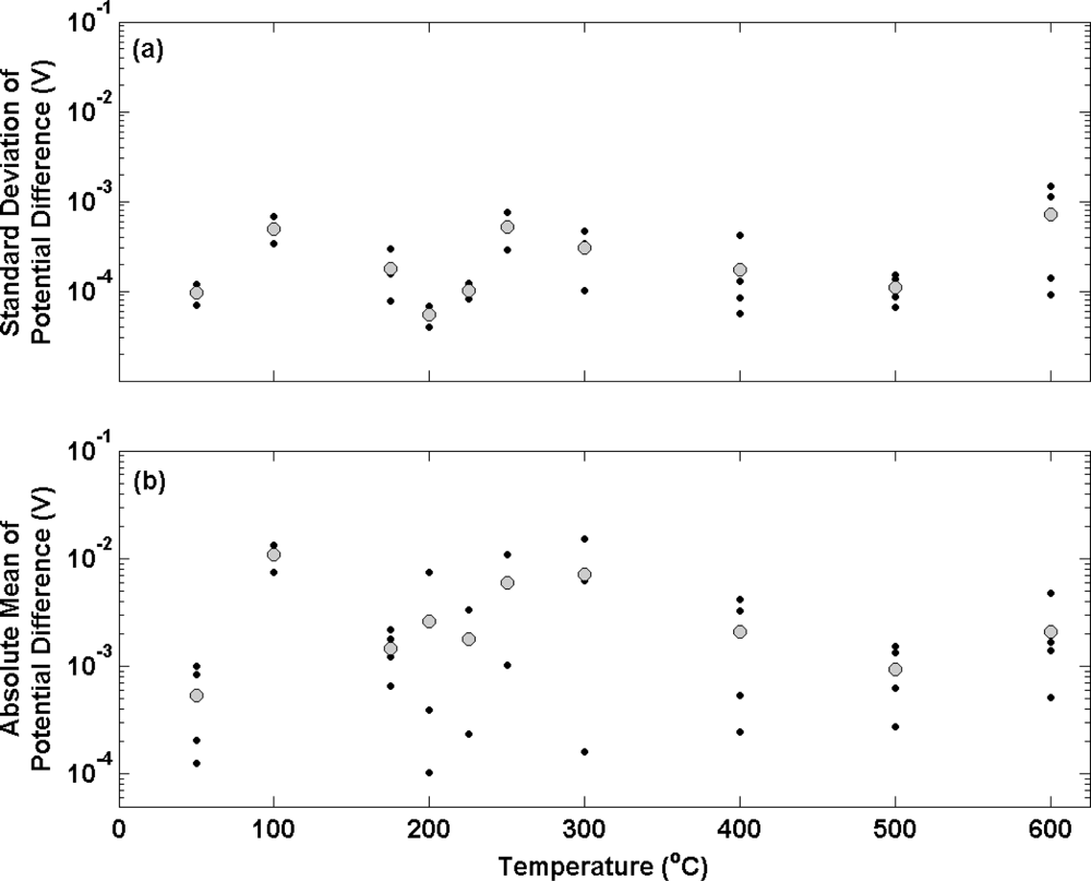 (a) Standard deviation and (b) absolute mean of the potential difference vs. a thermal electrolytic defacto reference electrode for electrolytic electrodes equilibrated in a 0.01 M HCl solution plotted as a function of anneaing temperature in nitrogen. The smaller black circles correspond to the standard deviation (a) and mean (b) of an individual electrode measured over a time period of 3 hours. The mean of the ensemble at each temperature in both sub-plots is shown by the larger grey circles.