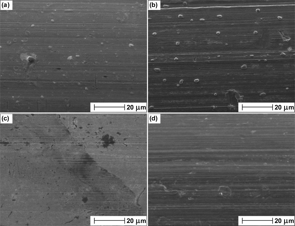 SEM images of Ag wire following a 2 hour annealing step in (a) air at 100 °C, (b) air at 400 °C, (c) nitrogen at 100 °C and (d) nitrogen at 400 °C. In each case the wire was placed in an atmosphere of hydrogen.
