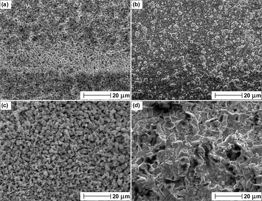 SEM images of Ag/AgCl produced by anodisation of Ag wire following a 2 hour annealing step in (a) air at 100 °C, (b) air at 400 °C, (c) nitrogen at 100 °C and (d) nitrogen at 400 °C.