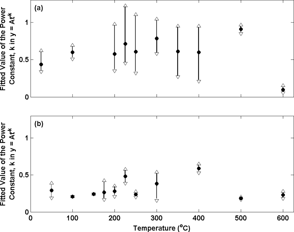 Transient potential difference measurements for electrolytic Ag/AgCl electrodes vs. a thermal electrolytic defacto reference electrode after transfer from a 0.01 M HCl solution to a 0.025 M Na2HPO4/ 0.025 M KH2PO4 buffer solution. The electrodes were equilibrated in a 0.01 M HCl solution prior to transference. The value of the exponent, k, in the power function of type y = A t−k was fitted to the first 60 s of the transient potential difference measurements and is plotted as a function of annealing temperature for Ag wire annealed in (a) air and (b) nitrogen. The black circles represent the mean power constant determined for the ensemble of electrodes at each annealing temperature. The triangles indicate the upper and lower power constants determined for the electrode ensemble at each temperature.
