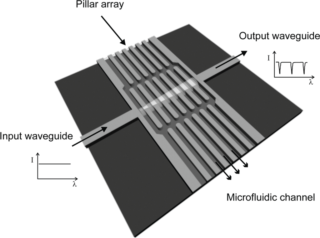 Schematic view of an on-column 1D photonic crystal refractive index chemical sensor. The detection region consists of a pillar array and integrated waveguides coupling infrared light through the resonator.