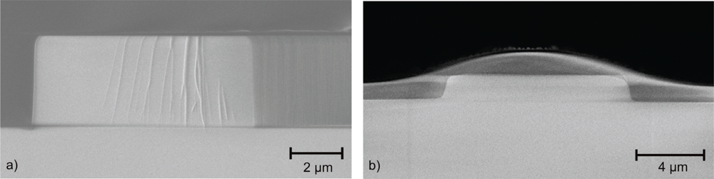 Figure 2(a) illustrates the cross section of a 9.0 × 3.0 μm2 SiON waveguide after etching and stripping the photoresist mask. The structures on the front facet are due to the cleaving method. Boron phosphorus glass (BPSG) was used as a cladding layer (3.8 μm thickness) as in our initial devices []. However, its flowing behavior upon annealing makes it difficult to obtain a perfect seal with a glass lid, due to the uneven surface topography, Figure 2(b). Hence, a different bonding method had to be developed. Annealing of the cladding layer was done in a nitrogen atmosphere for 8 hours at 1,000 °C.