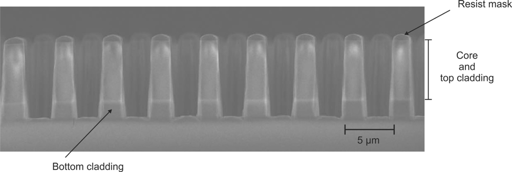 The second lithographic step was performed after the anneal step and similar conditions were used as in the first lithographic step, albeit with a 3.3 μm thick layer of resist. A thicker resist layer was necessary since an 8 μm deep etch was required for the microfluidic/pillar regions in order to go through the waveguide core layer. Figure 3 illustrates a part of the pillar array (before removing the resist mask), where a clear interface between the bottom cladding and the core/top cladding is seen. The pillar array had a periodicity of 5.0 μm and a height of 7.6 μm.