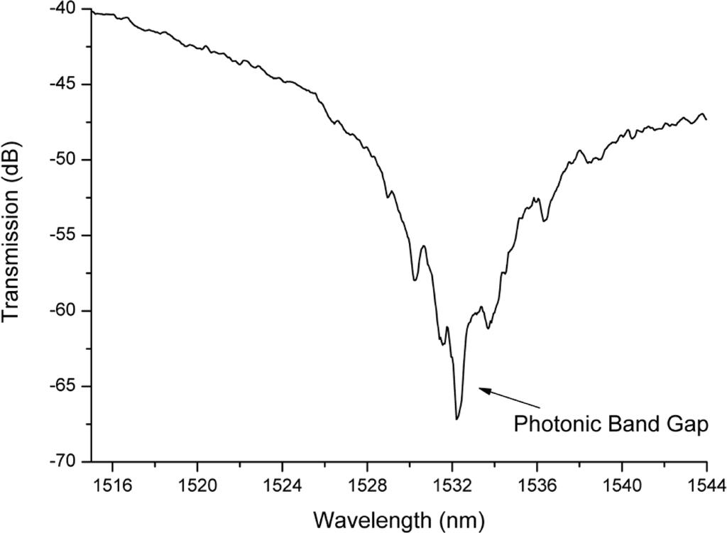 Transmission spectrum of a reference ethanol solution (96.00%) pumped into a microfluidic channel with an 18 pillar array. The 27 dB loss observed at 1532.312 nm corresponds to a convoluted loss of the several modes propagating in the waveguide and not to a specific mode band gap of the resonator.