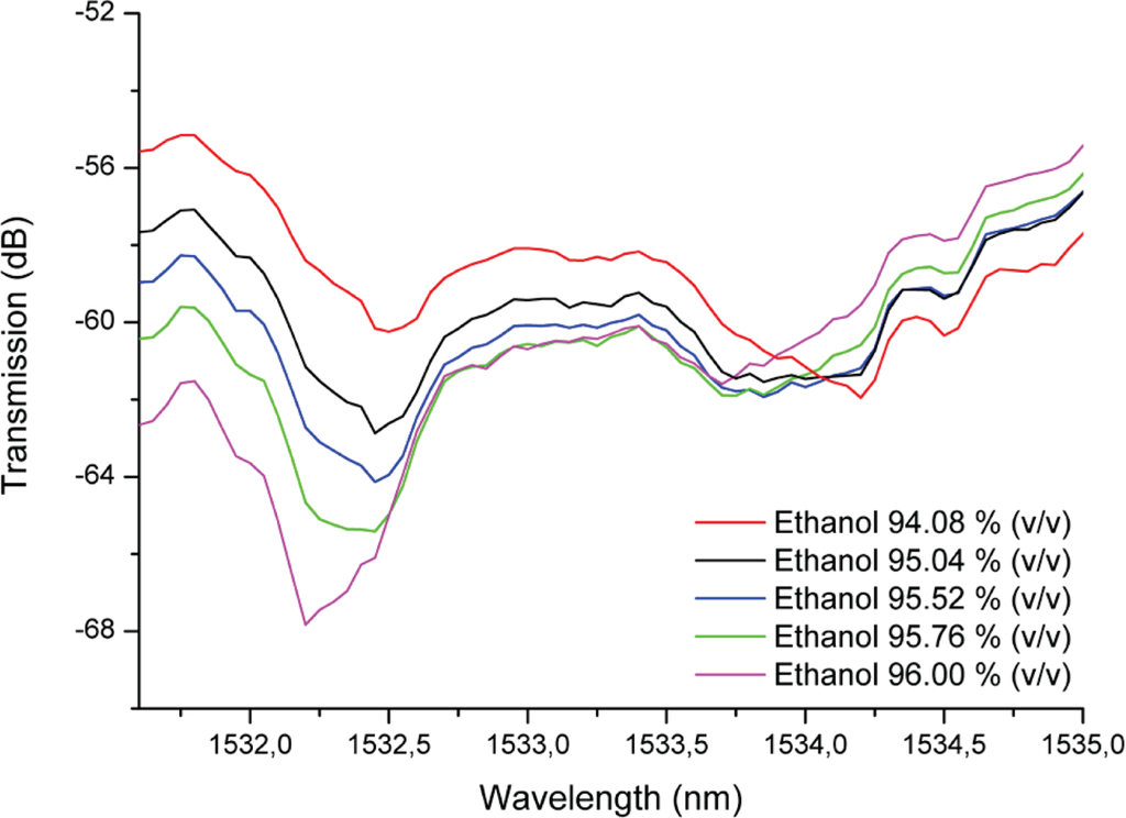 Several experiments were performed by continuously pumping 96.00% ethanol stock solution through the microfluidic channel and measuring the transmission spectra. This enabled the measurement of a considerable dB loss at 1532.312 nm, as shown in Figure 4. The peak measured at 1532.312 nm corresponds to a convolution of the peaks observed for each mode propagating in the waveguide and resonator, but will here, for the sake of simplicity, be addressed as the band gap. A Q-factor of 2,190 was obtained for the center peak present in the band gap. Moreover, emptying the microfluidic channel and filling it again several times with the same solution resulted in a standard deviation of 0.002% (1532.312 ± 0.029 nm). Pumping of fluids with higher refractive indices caused the resonance peaks in the spectra to shift to longer wavelengths, as depicted in Figure 5.