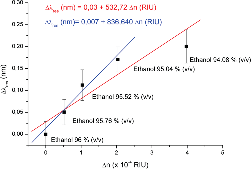 Shift of the resonant wavelength plotted as a function of refractive index shift (Δn). Linear fit of the experimental data yields Δλ/Δn ≈ 532 nm/RIU (sensitivity) for a dynamic range of 4 × 10−4 RIU (R2 = 0.84). For a dynamic range of 2.1 × 10−4 RIU, the linear fit of the experimental data yields a sensitivity of Δλ/Δn ≈ 836 nm/RIU (R2 = 0.97). The error bars refer to fluctuations on the resonant wavelength after successive injections with the same fluid.