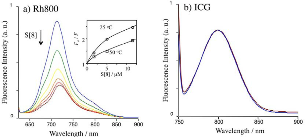 To examine the complexing abilities of Rh800 and ICG, we measured their fluorescence spectra in the presence of S[n]. Since it is well known that S[8] strongly binds to rhodamine 6G [27] and rhodamine B [22], we first examined the effects of S[8] on the fluorescence spectra of Rh800 and ICG. (Figure 2). The fluorescence of Rh800 was quenched by S[8]. However, the fluorescence of Rh800 was not completely diminished even with the addition of excess amounts of S[8]. To gain insight for the quenching mechanism [34] for Rh800, we measured the temperature dependence of the fluorescence quenching by S[8]. The Stern-Volmer plots at 25 °C and 50 °C are shown as an inset in Figure 2a. It should be noted that Rh800 is quenched more effectively at lower temperature. This result indicates that the fluorescence quenching of Rh800 dose not result from the dynamic (collisional) interaction between Rh800 and S[8]. In the case of ICG, fluorescence changes were not observed by addition of S[8], indicating that ICG (as a twitter ion) has no binding ability to S[8]. This result is consistent with our previously reported result [23] that a cationic fluorescent ACh analog, dansylcholine binds to S[8], while a neutral fluorescent ACh analog, dansylsulfoamide does not bind to S[8].