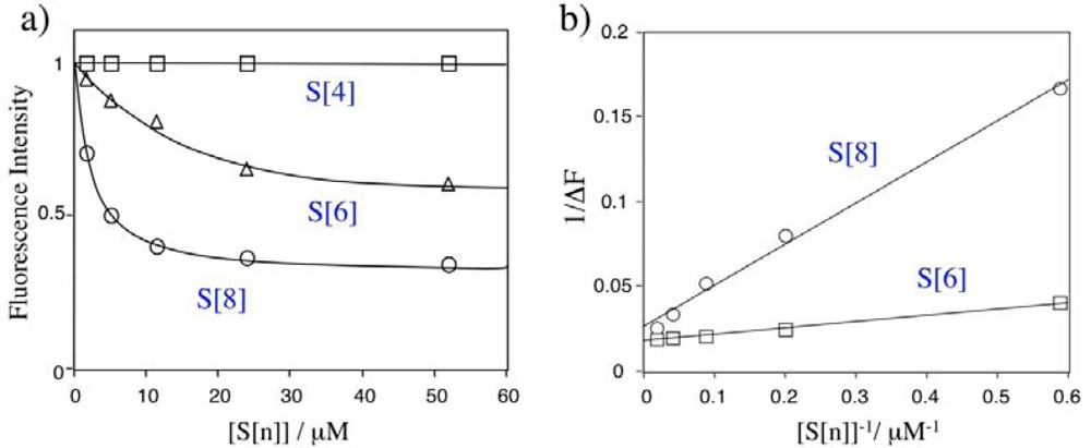 (a) Relative fluorescence intensity of Rh800 (40 nM in PBS) in the presence of S[n]. S[n] (1 mM) was added to the aqueous solution of Rh800 (40 nM) under stirring. (b) Plots of 1/ΔF versus 1/ [S[n]].