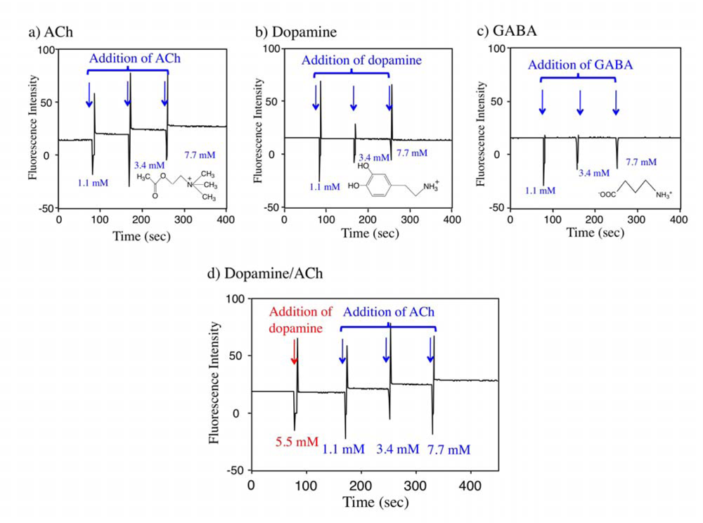 To check the detection selectivity of the Rh800-S[8] complex, we first examined the effects of ACh, dopamine, and GABA on the fluorescence intensity of the Rh800-S[8] complex. Dopamine is one of monoamine neurotransmitters that have cation charges similar to ACh [35]. GABA (γ-aminobutyric acid) is the chief inhibitory neurotransmitter in the central nerve system [36]. GABA is a kind of amino acids with no net charge. We measured the time course of the fluorescence intensity of the Rh800-S[8] solution upon addition of ACh, dopamine, and GABA. The fluorescence intensity of Rh800 responded to the successive additions of ACh as shown in Figure 5a. In contrast, the addition of dopamine and GABA up to 7.7 mM did not change the fluorescence intensity of Rh800 (Figure 5b and 5c). The effect of ACh on the Rh800 fluorescence was also examined in the presence of 5.5 mM of dopamine. As shown in Figure 5d, the fluorescence response of Rh800 for ACh was not hampered by dopamine. These results show that the fluorescence response of Rh800-S[8] complex is sensitive to ACh compared to dopamine and GABA.