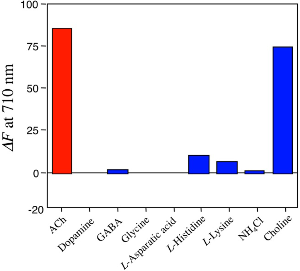 Fluorescence changes (ΔF at 710 nm) in Rh800-S[8] solution upon adding ACh, other neurotransmitters (dopamine, GABA, glysine, l-asparatic acid), basic amino acids (l-histidine, l-lysine), ammonium chloride, and choline. 100 μL of these chemicals (350 mM in water) was added to the Rh800-S[8] solution (3 mL), where [Rh800] = 40 nM and [S[8]]/[Rh800] = 800.