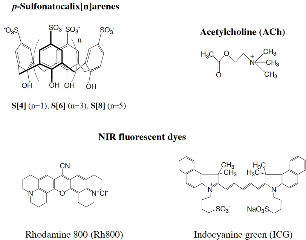 Molecular structure of the p-sulfonatocalix[n]arenes (S[n]): acetylcholine (ACh), and the NIR-fluorescent dyes: rhodamine 800 (Rh800) and indocyanine green (ICG).