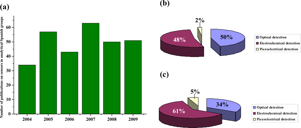 (a) Number of publications on sensors from analytical Spanish groups during 2004–2009. Distribution of publications according to the type of transduction used in Spanish (b) and international (c) analytical groups.