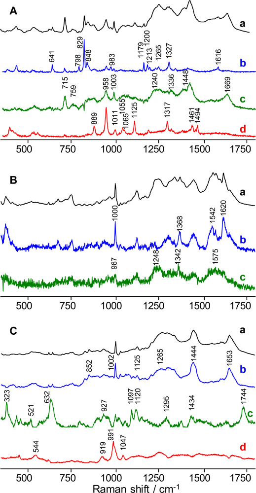 Multi-dimensional spectroscopic signatures of semen (A), blood (B) and saliva (C); average Raman spectra obtained for each body fluid (a, black lines), and principal spectral components (b–d; blue, green and red lines).