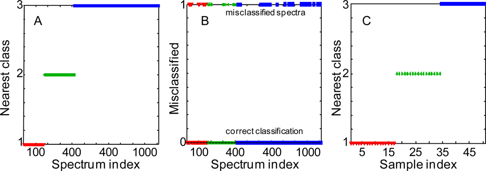 While SIMCA is a very useful classification tool, the PCA submodels in SIMCA are computed with the goal of capturing the variation within each class. Directions in the data space that discriminate classes are not identified in SIMCA. In LDA, linear combinations of variables are computed to determine directions in the spectral space; discriminant functions maximize the variance between groups and minimize the variance within groups according to Fisher’s criterion. For the validation of the LDA model, the leave-one-out cross-validation was used. In this method, all spectra except one were used to build a LDA model and then to classify the left out spectrum. This method is repeated so that each spectrum is predicted once.