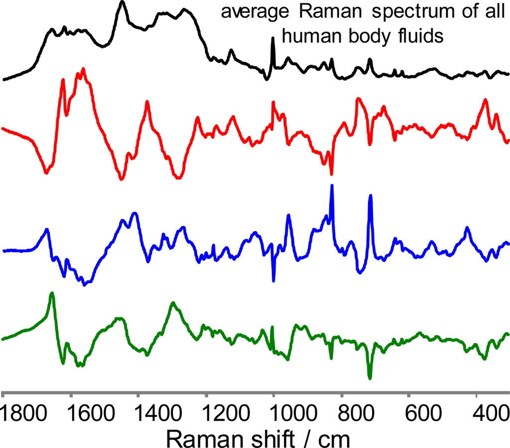 Difference between the average Raman spectrum of all human body fluids (black) and averaged Raman spectra of human blood (red), semen (blue) and saliva (green). Spectra are scaled for comparison.