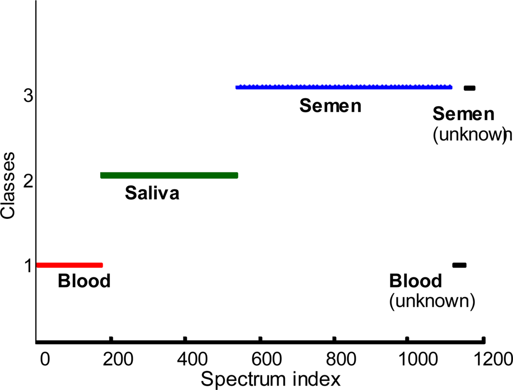 The body fluid traces recovered at crime scenes are among the most important types of evidence to forensic investigators [1]. Conventional methods of body fluid identification use labor-intensive, technologically diverse methods that are performed one after the other and are costly in terms of time and sample usage [2,3]. The objectives of any crime scene investigation are to preserve physical evidence and collect only valuable evidence for the analytical examination [3]. So, the ability to characterize an unknown stain at the scene of the crime without destruction and having to wait for laboratory results is a very critical step in crime scene investigation.