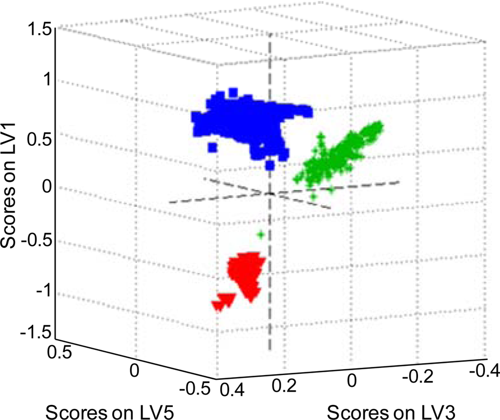 A three-dimensional latent variable plot for human blood (red), semen (blue) and saliva (green) samples based on the first, third and fifth latent variables (LV).