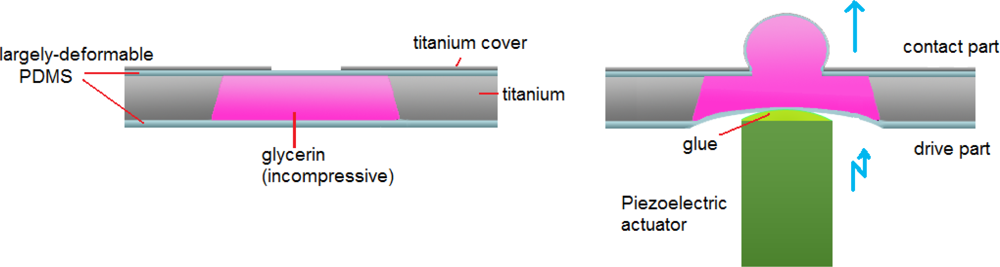 In our previous work [13], we devised a mechanism using a totally encapsulated liquid able to amplify displacements up to 15-fold. It consisted of a microcavity with different cross-sectional areas, etched in a silicon wafer, and containing a liquid sealed by two easily deformable thin polydimethylsiloxane (PDMS) membranes. A displacement applied to the input surface was amplified at the smaller output surface.