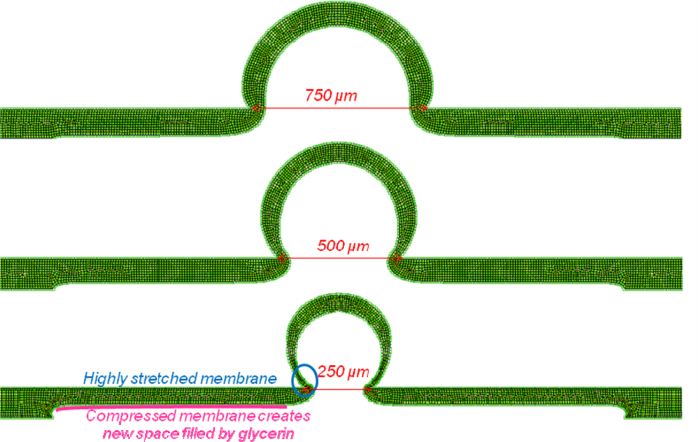 Deformed states obtained by FEM analysis for 750, 500 and 250 μm-contact part sizes with a 100 μm-thick PDMS membrane, same volume displacement.