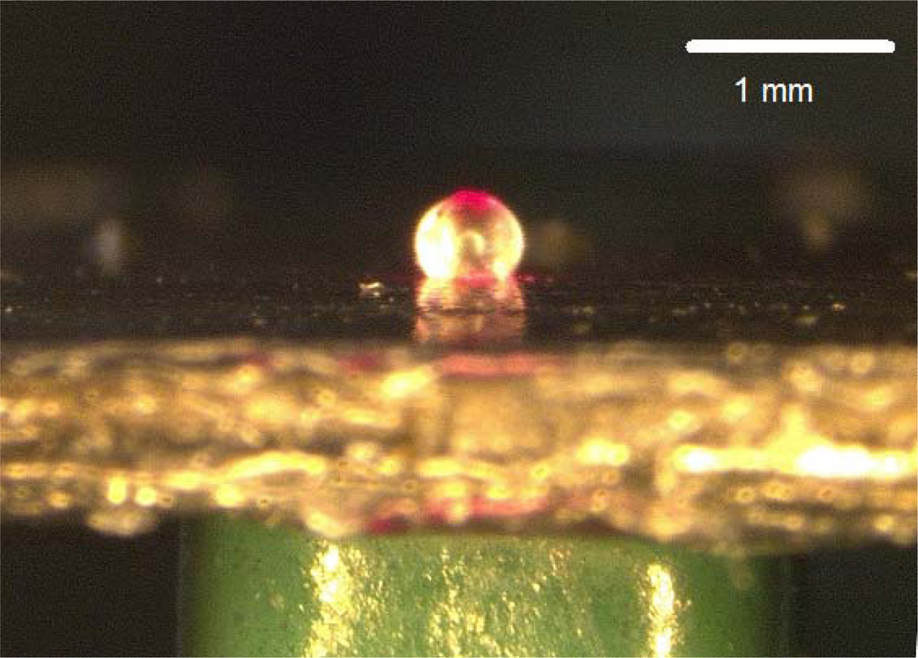 A 200-μm-thick titanium wafer was used to form the microcavity. The titanium wafer is etched by hydrofluoric acid (HF) using copper as a protective layer. However, noticing poor adherence between Ti and Cu in a HF environment, we use AZ photoresist as an adhesive layer to secure protection of the Ti by Cu during etching. We made a largely deformable PDMS polymer by mixing DC 3145 CLEAR and RTV thinner (Dow Corning Toray Inc.). DC 3145 CLEAR is a PDMS elastomer that can stretch more than 650%. The thinner was added in order to decrease the viscosity of the elastomer so that we could prepare appropriately thick membranes by spin coating. Good results were obtained when the ratio of the volumes of DC 3145 CLEAR and RTV thinner was 1:2. The results indicated that the Young's modulus of the largely-deformable PDMS was 32 kPa, while strains are small and it could stretch more than 450% [12]. This PDMS is much less stiff than the SILPOT 184 (Dow Corning Toray Inc.) often used in MEMS and was thought to be suitable for our HDAM. Given the large gas permeability of PDMS [14], glycerin presents the advantage over water of being non-volatile (vapor pressure of glycerol is 0.133 Pa at 25 °C compared to 3,173 Pa for water) so this ensures the long-term use of the mechanism.