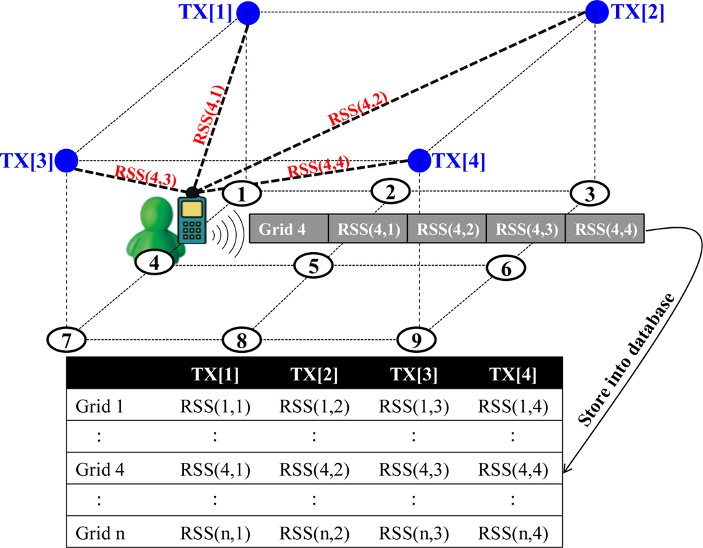 Many algorithms such as the triangulation method and the fingerprinting method have been proposed to investigate the possibility for indoor positioning [4,7,12]. The triangulation method requires a signal propagation model to convert RSS values into signal transmission distances, the parameters of the propagation model are strongly location dependent and are different for different environments. Since the indoor environments are extremely complicated, it would be very difficult to find an exact model to describe the relationship between the signal strength attenuation and the transmission distance. In general, a simplified signal propagation model is commonly utilized to calculate the transmission distance [6], and then the QILS method is used to estimate the user location [8]. However, since the multipath effect is severe in indoor environments, the positioning accuracy of the triangulation method is not sufficient in most cases. To overcome this problem, the fingerprinting method was proposed, and the main concept of the fingerprinting method is to use the received signal strength as the tag of the location. It requires two stages to perform the fingerprinting, including the calibration (training) stage and the verification (positioning) stage [9]. In the calibration stage, one assigns an appropriate number of calibration points in the space of interest, and the RSS values of each calibration point have to be measured in sequence and these RSS values are then recorded as the fingerprints in the database. As illustrated in Figure 1, a user with the receiver (RX) visits all the calibration points sequentially to measure the corresponding RSS values of the incoming signals from four transmitters (TXs). For example, when the user visits the calibration point 4, the received RSS values of the incoming signals from four transmitters could be expressed as a vector, and these RSS values and the associated coordinates of the calibration points will be stored into the database for future use.