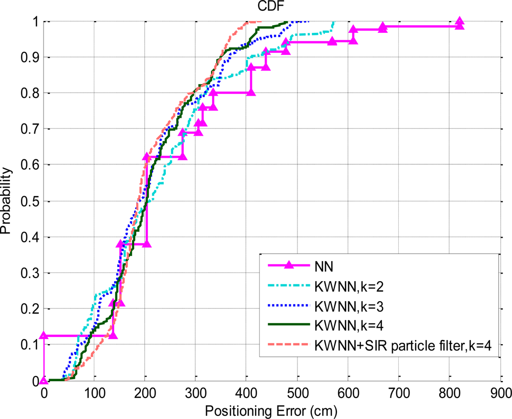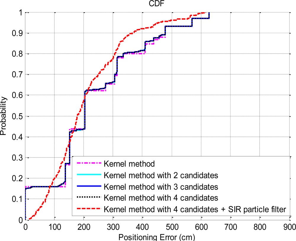 Based on the experimental results, the SIR particle filter significantly improves the positioning accuracy, and the maximum positioning error is reduced to 4.3 meters (in Figure 10). In addition, we apply the probabilistic approach based on the kernel method to analyze the CDFs of the positioning errors. The CDFs of the positioning errors with the probabilistic approach based on the kernel method are shown in Figure 11.