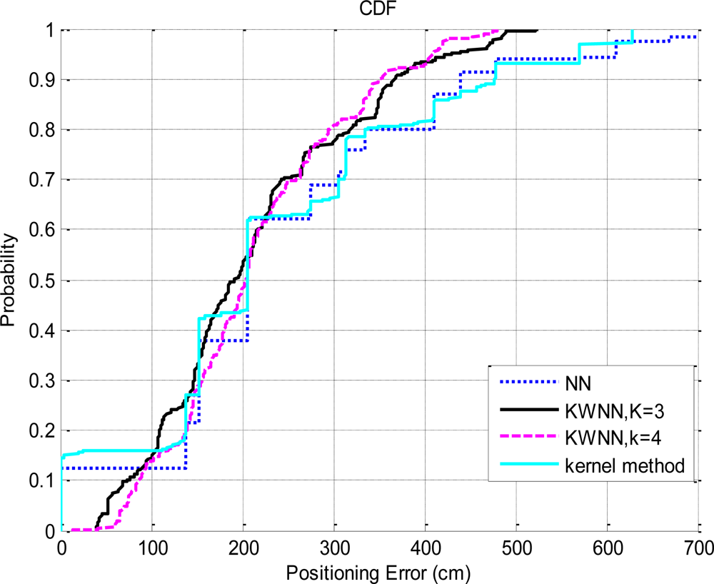 Based on the experiment results shown in Figure 12, although the positioning performance of the kernel method is slightly better than that of the NN algorithm, the KWNN algorithm with K = 3 or 4 would still be a better option than the use of the probabilistic approach based on the kernel method.