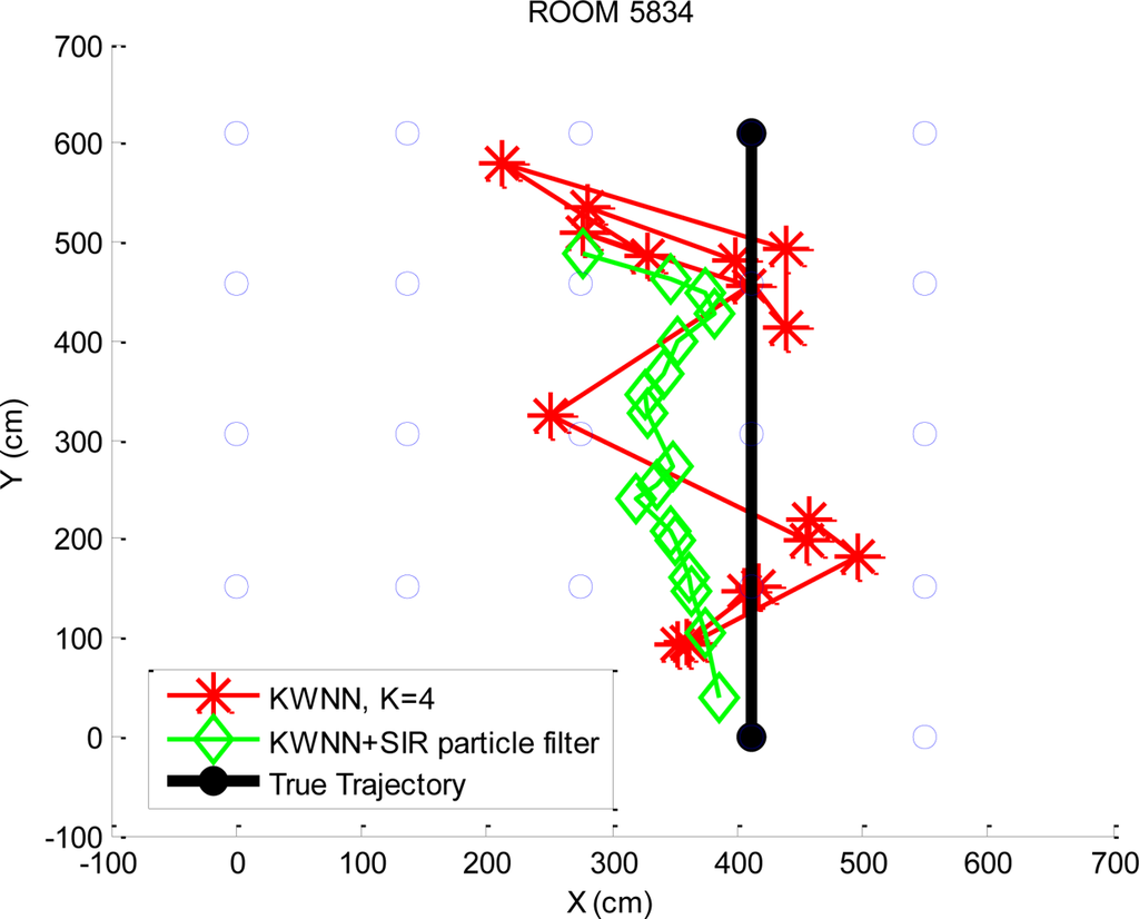 The values of mean and the standard deviation used in Equations (18) and (19) are determined by the empirical data, and these velocities and accelerations can be changes if there are available velocities and accelerations measurements. Table 1 shows the standard deviations of the positioning errors by applying the KWNN algorithm and the KWNN algorithm with the SIR particle filter for different values of K.